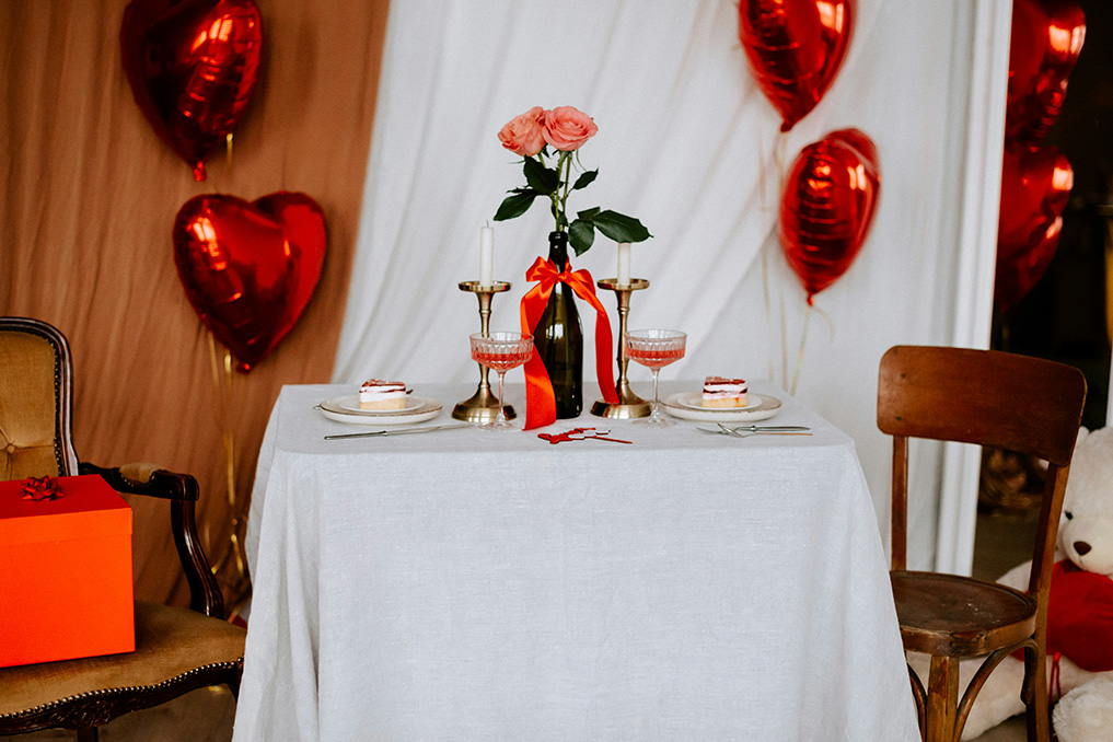 • Paper hearts taped to chairs, candles on the table, handwritten place cards