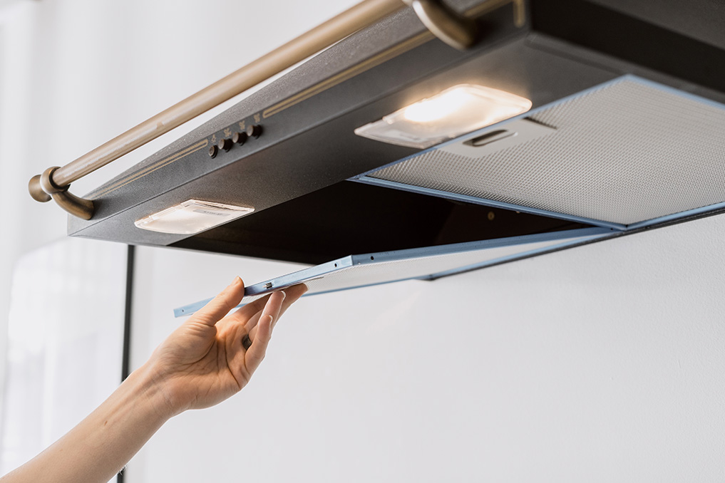 Range hood filters are found above your stove and may slide out or be latched in place. Fill your sink or a large glass baking dish with boiling water, a tablespoon of dishwashing soap, and a hefty sprinkle of baking soda. Leave the range filter to soak for 10-15 minutes, but be sure to remove it before the water cools and the grease resettles onto the filter. For stubborn particles, gently scrub with a sponge or toothbrush. Once clean, rinse it well with hot water, let it dry, and return the filter to the range hood.