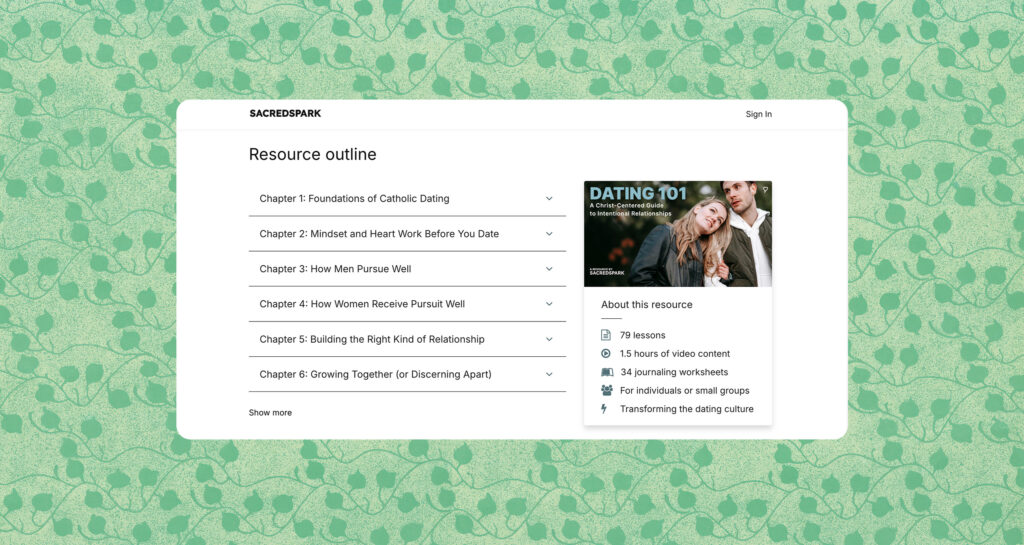 The course encourages those wanting to date to do the inner work. Hurt people hurt people, and dating well starts long before the first date. It starts with how you see others, past relationships, how you handle conflict, and how you view yourself and God. You’ll learn how women can be receptive, the ways men can pursue well, and unique Catholic dating challenges, including long distance dating and signs of relationship growth or if it’s time to let go.