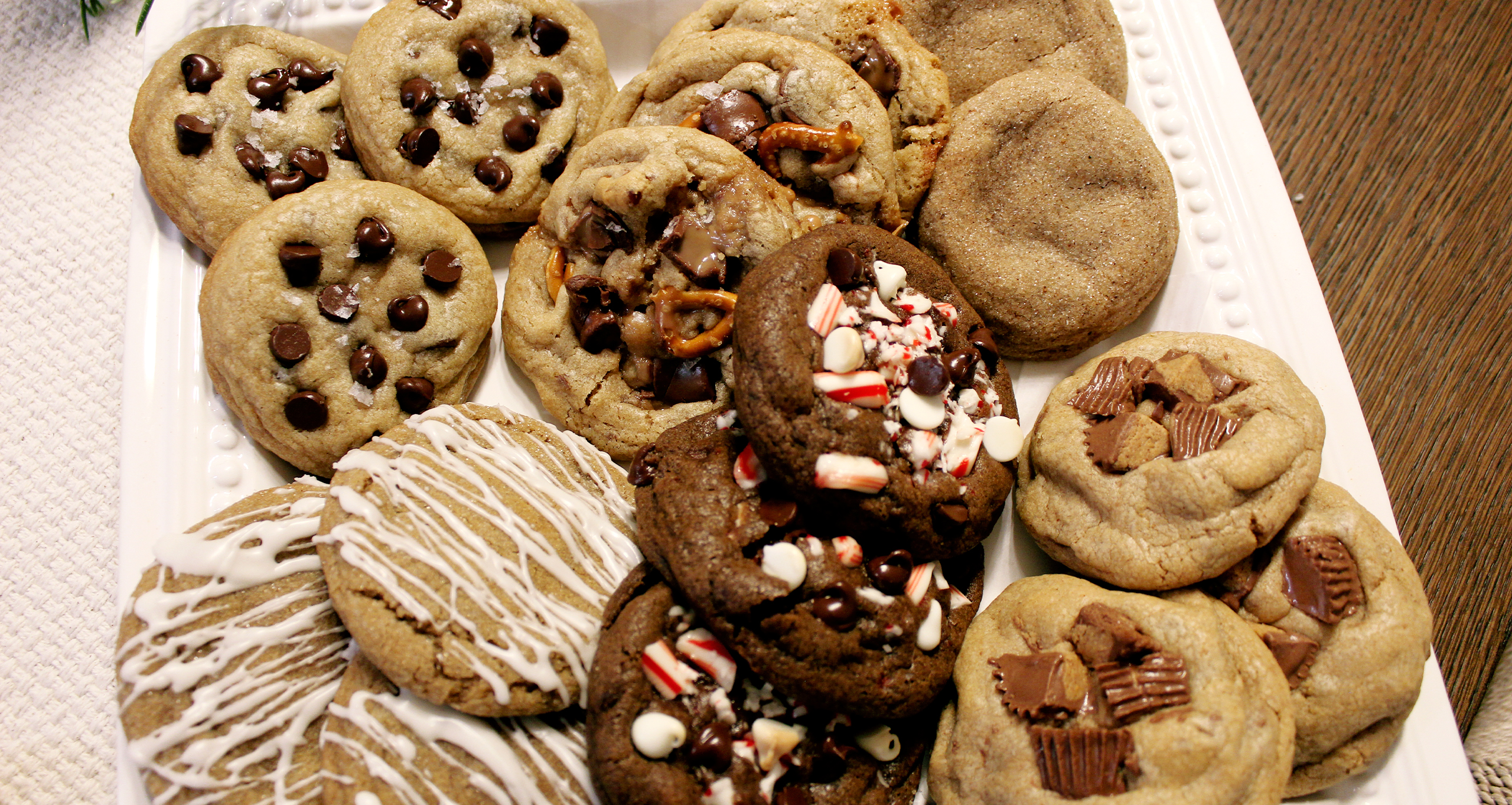 Soft gingerbread • Chocolate caramel pretzel • Eggnog snickerdoodle • Chocolate peppermint • Peanut butter cup • Classic chocolate chunk