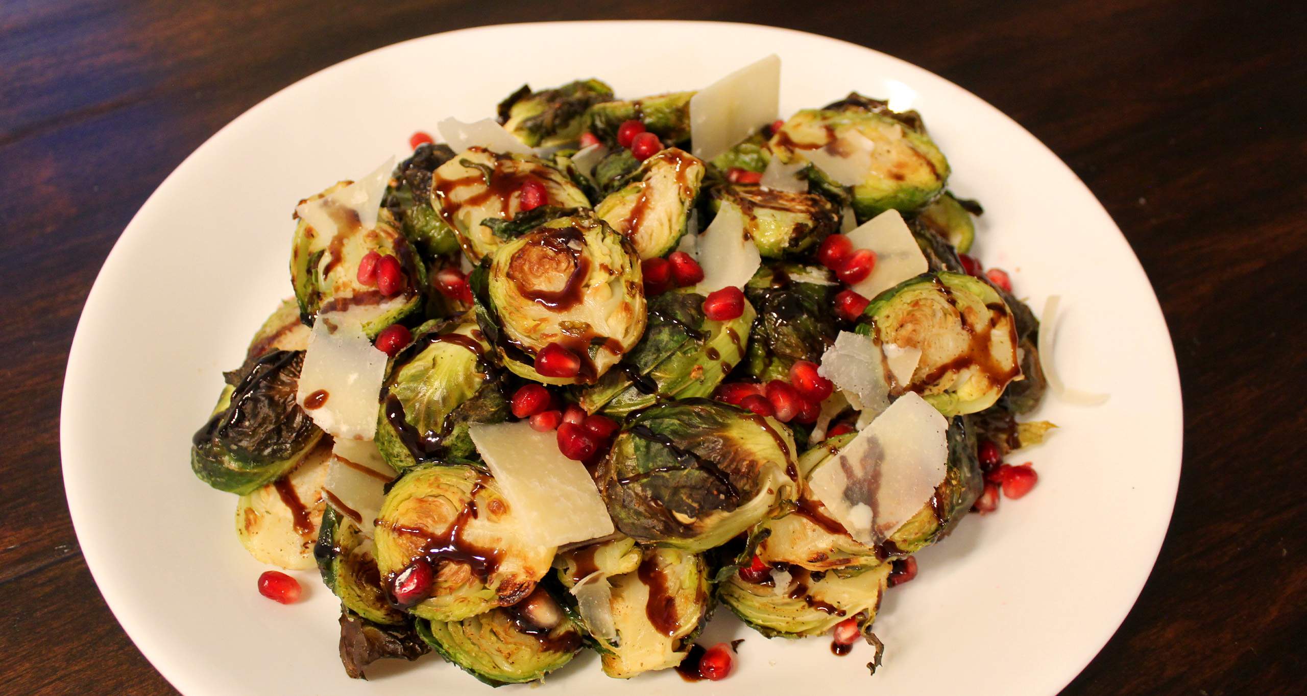 Roasted Brussels sprouts with balsamic glaze, pomegranate, and Parmesan