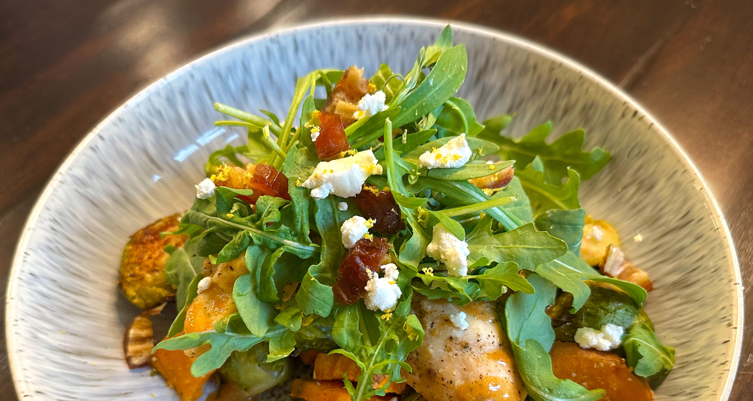 6. While the chicken, potatoes, and Brussels sprouts are baking, make the arugula salad topping. In a bowl, toss arugula, feta, dates, lemon zest, salt, and black pepper.