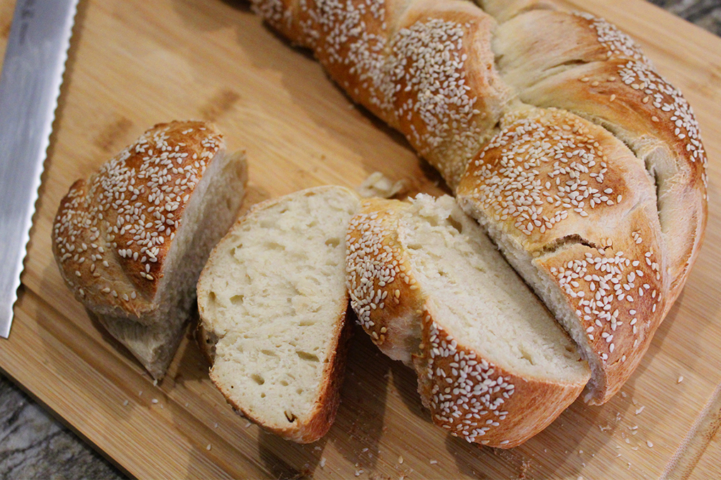 - Once the oven has reached temperature, beat 1 egg, brush the loaf with the egg wash, and generously sprinkle with white sesame seeds. Bake for 35-40 minutes until golden brown and crusty.